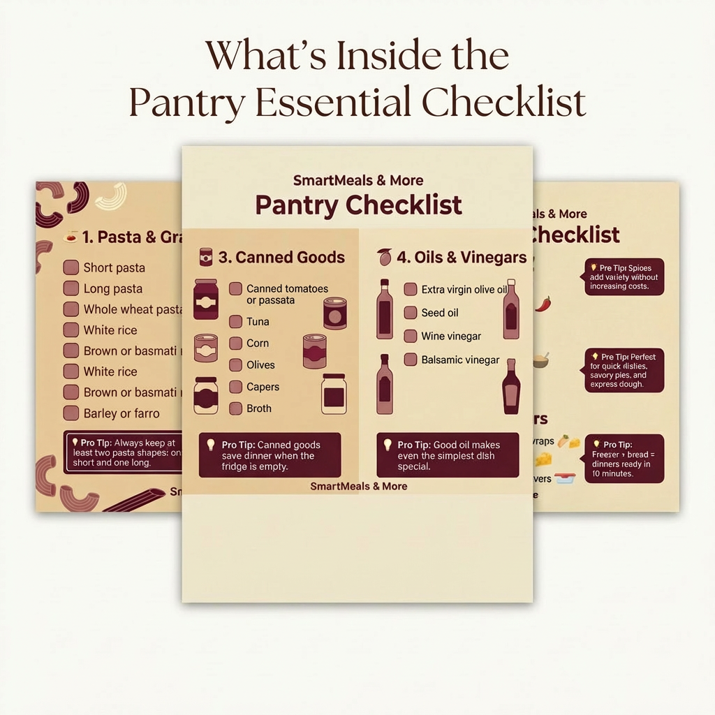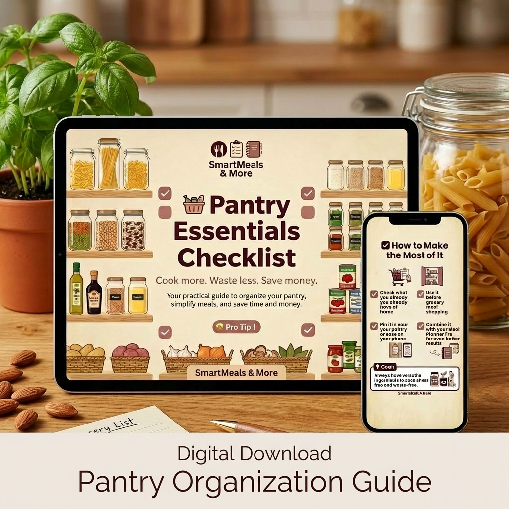 The Pantry Essentials Checklist is a simple but powerful digital guide designed to help you build a well-stocked pantry so you can cook quick meals anytime.